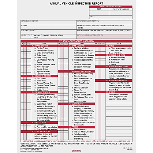 Annual Vehicle Inspection Forms | J.J. Keller Complies with 49 CFR Part 396 Annual Vehicle Inspection requirements. (1) Annual Vehicle Inspection Report, 2-Ply w/ Carbon - Stock Snap-out format, 8-1/2" x 11-3/4" (7) Annual Vehicle Inspection Report Label Handy label/sticker can be easily attached to equipment to show compliance with inspection requirements. (5)