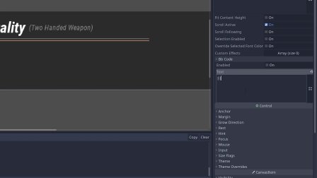 teebarjunk/godot-3-richtextlabel-addons - GitHub RichText Addons - BBCode Evolved! v1.2. Adds 3 new classes for RichTextLabel:. RichTextLabel2 - The base class.; RichTextLabelAnimation - For text that animates in and out.; RichTextTable - Table with sortable columns.; RichTextLabel2. Automatic DynamicFonts management. Simply input a font name and size. (Font's should be in a res://fonts/ folder.); Close any tag with a simple [].
