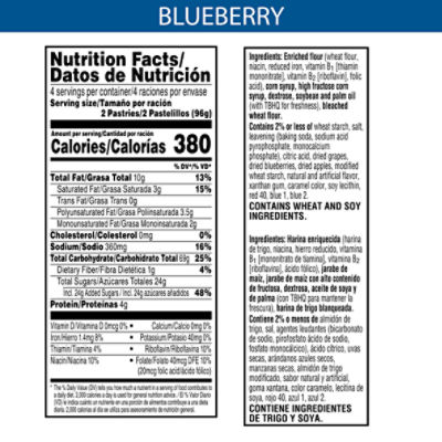 Nutrition Facts for Pop-Tarts Unfrosted Blueberry Toaster Pastries ... Nutrition Facts Serving Size pastries 2 pastries = 96g Amount Per Serving 380 Calories % Daily Value* 15% Total Fat 10g 18% Saturated Fat 3.5g Trans Fat 0g 0% Cholesterol 0mg 16% Sodium 360mg 23% Total Carbohydrate 69g 4% Dietary Fiber 1g Total Sugars 25g 48% Includes 24g Added Sugars Protein 4g 0% Vitamin D 0mcg 0% Calcium 0mg 8% Iron 1.5mg