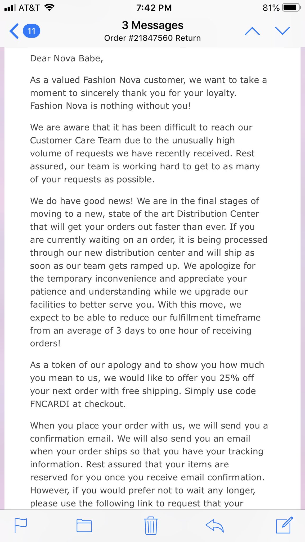 How to Return an Order with Fashion Nova App on iPhone or iPad - wikiHow Here's how to contact Fashion Nova: Scroll to the bottom of the page and tap CONTACT CUSTOMER CARE 24/7 HERE. Tap Return Assistance. Fill out the form and tap Submit. Make sure your item qualifies for a return. Most items can be returned for a full credit as long as you're within 30 days of the original shipping date. Our return policy and process | Fashion Nova You have 30 days from the date of delivery to return your item. The majority of returns are refunded via store credit in the form of a Fashion Nova gift card. Returns are processed within 5-7 business days after your item (s) are delivered to us. To receive your store credit more quickly, use the prepaid return label option in our Returns ... How refunds work | Fashion Nova Item (s) proved to be received damaged, defective, or incorrect. Fashion Nova will take 2-5 business days to clear your refund. Depending on your financial institution, the refund amount may take up to 10 business days to post to your account. If you used a gift card to purchase your item (s), your funds will be issued back to your gift card ... STEP BY STEP: How To Do A Fashion Nova RETURN - YouTube 👀👀👀👀HEY, Thanks for Watching! STEP BY STEP: How To Do A Fashion Nova RETURN + PACKING & SHIPPING (Updated 2021) I am once again here to show y'all step b...