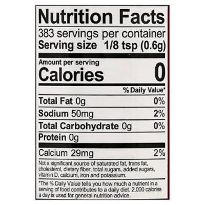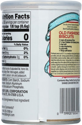 Nutrition Facts for Clabber Girl Baking Powder • MyFoodDiary® Baking Powder Nutrition Facts Serving Size tsp 1/8 tsp = 0.6g Amount Per Serving 0 Calories % Daily Value* 0% Total Fat 0g 0% Saturated Fat 0g Trans Fat 0g 0% Cholesterol 0mg 3% Sodium 60mg 0% Total Carbohydrate 0g 0% Dietary Fiber 0g Total Sugars 0g 0% Includes 0g Added Sugars Protein 0g 0% Vitamin D 0mcg 0% Calcium 0mg 0% Iron 0mg