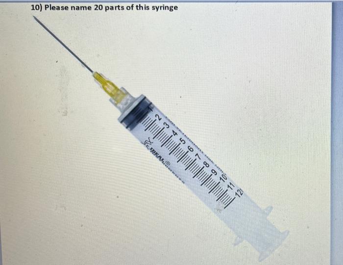 Understanding the Parts of a Syringe | Air-Tite Products Co Generally speaking, there are three parts to any given syringe: #1. The Barrel—The barrel forms the body of a syringe that houses the plunger. It's typically graduated, which means the markings indicate accurate measurement volumes. The majority of barrels are made out of clear, see-through plastic. However, in some instances, an opaque ... Unit.12 Flashcards | Quizlet Study with Quizlet and memorize flashcards containing terms like The component parts of a syringe consist of? a. A barrel b. A plunger c. The flange and the tip d. All of these, The parts of a typical needle are? a. The point, the lumen, the shaft b. The point, the shaft, the hub c. Point, Bevel, lumen, shaft, hub, and hilt d. Point, hilt, bevel, and hub, Syringes are named according to? a ... What Is A 2-Part Syringe? - Kmed-Leading infusion set manufacturer ... Definition. One type of syringe comprises two parts: (1) the plunger and (2) the barrel. Having these essential parts, we call this syringe the 2-part syringe. 2 part syringe. Basically, a syringe is a medical device used to inject or remove fluids from the body. That fluid could be in the form of blood or medication.